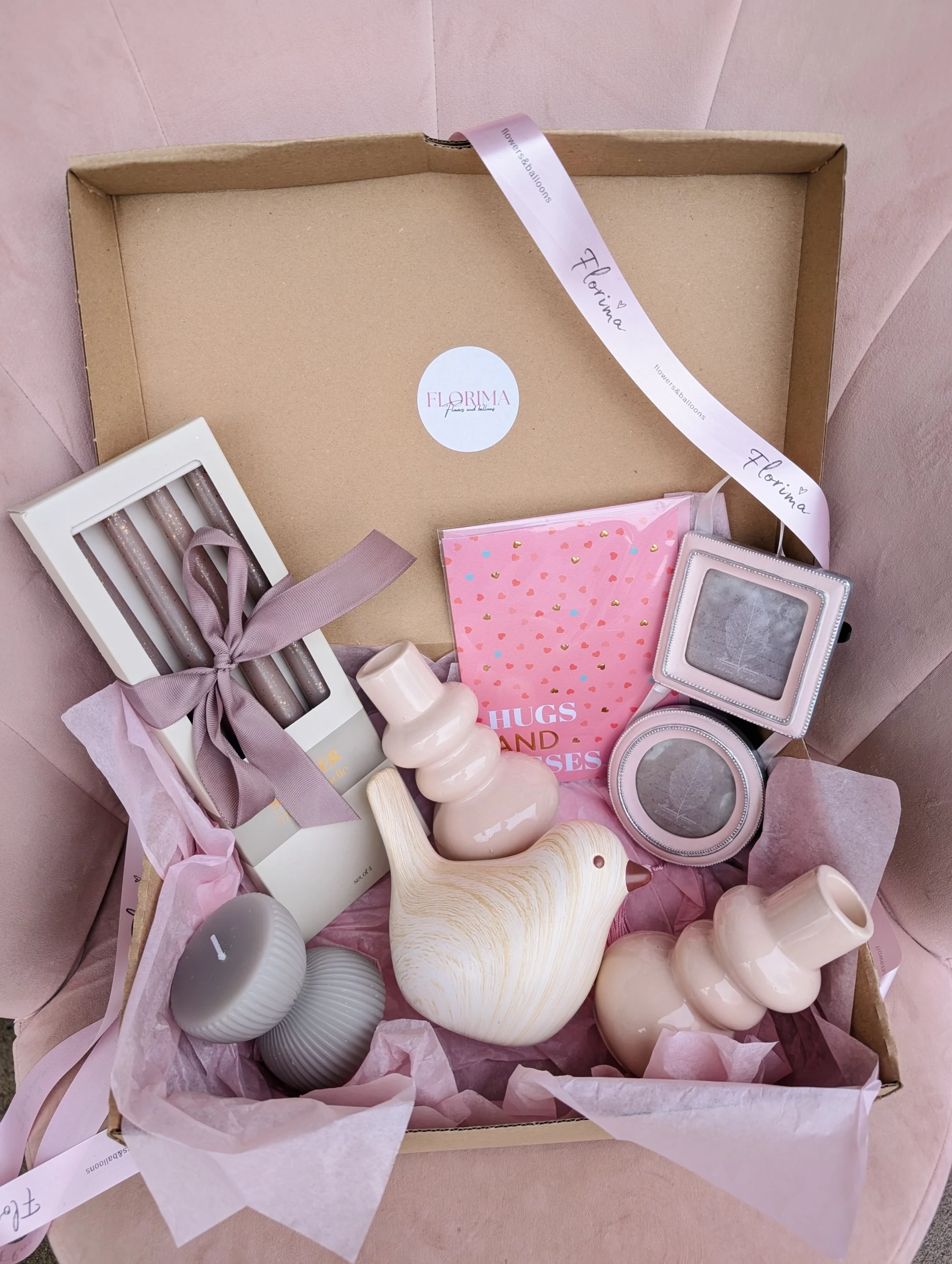 Box composition: bird., candlesticks, candles, card, frame. The gift is nicely wrapped and tied with a ribbon with a bow