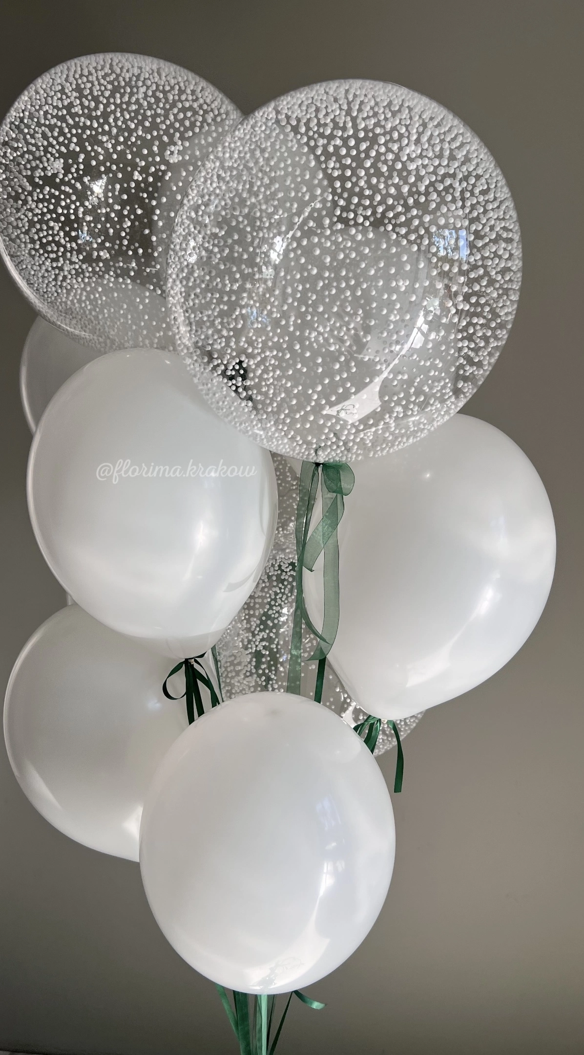 - bouquet of latex balloons, filled with helium, white and with confetti, 10 pcs.
