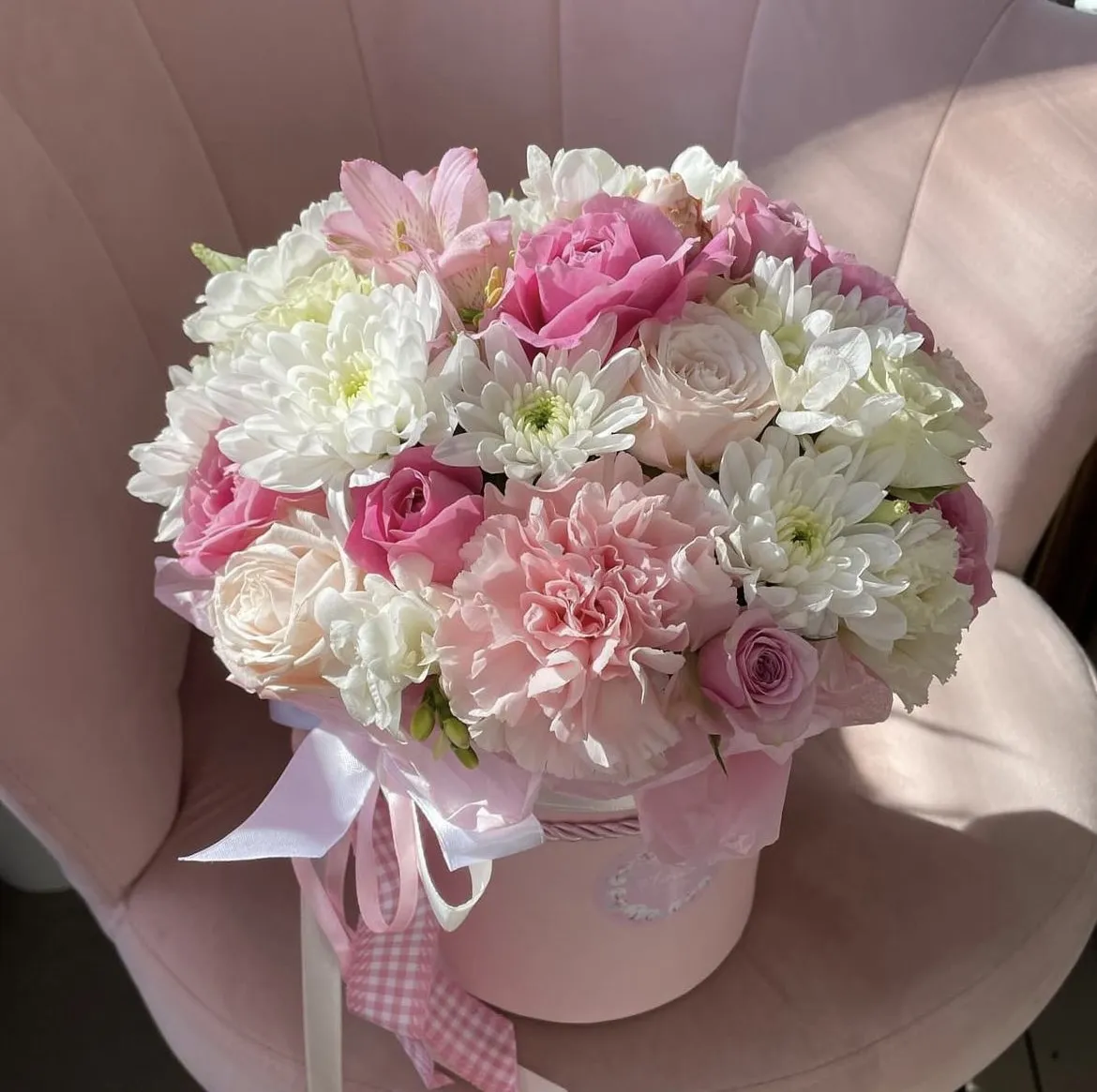 Flowerbox composition: chrysanthemum, branch rose, carnation, alstromeria, freesia