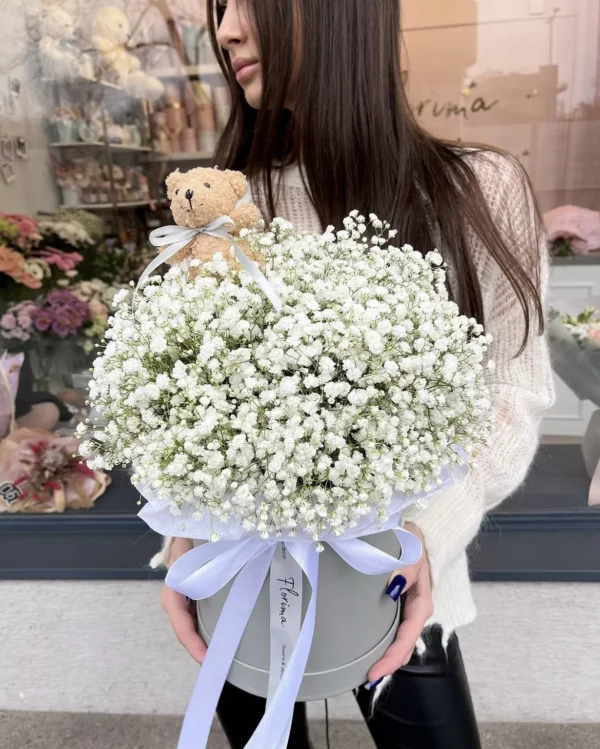Composition of the bouquet: gypsophilium, little bear