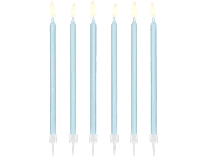 Birthday candles, smooth, light blue, height approx. 14 cm. Set contains 12 candles and saucers. (1 pack / 12 pcs.)