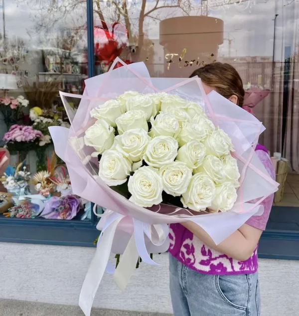 Skład bukietu:białe róże 50-60 cm w opakowaniu, kraj pochodzenia Ekwador