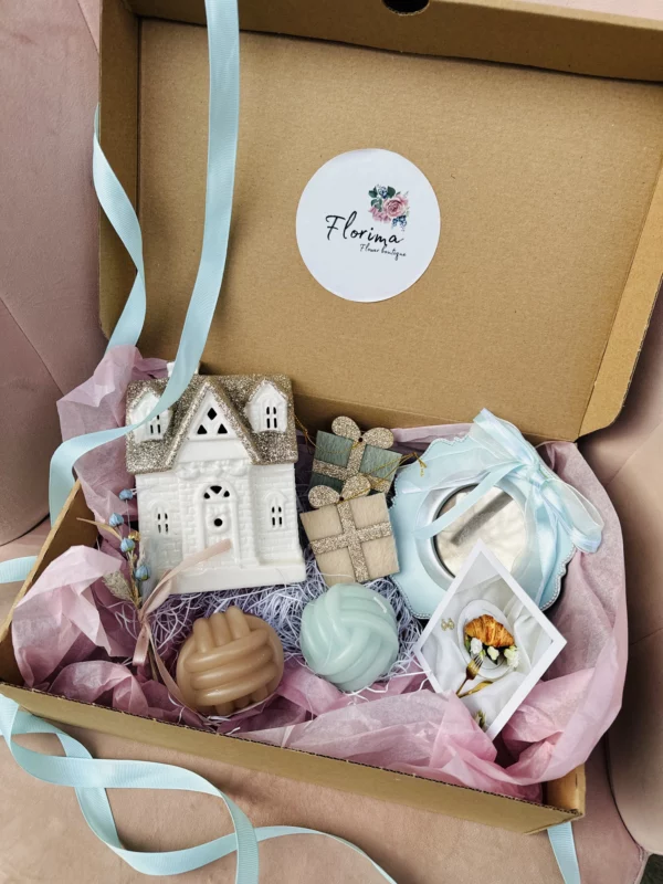 Skład boxu: Domek świecący, mały bukiecik z kwiatów suszonych, świeca x2, kartka, ramka. Prezent jest ładnie zapakowany i zawiązany wstążka z kakardą