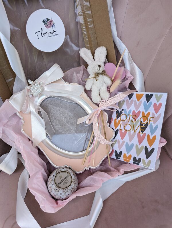 Skład boxu: króliczek, mały bukiecik z kwiatów suszonych, świeca, ramka, kartka. Prezent jest ładnie zapakowany i zawiązany wstążka z kakardą