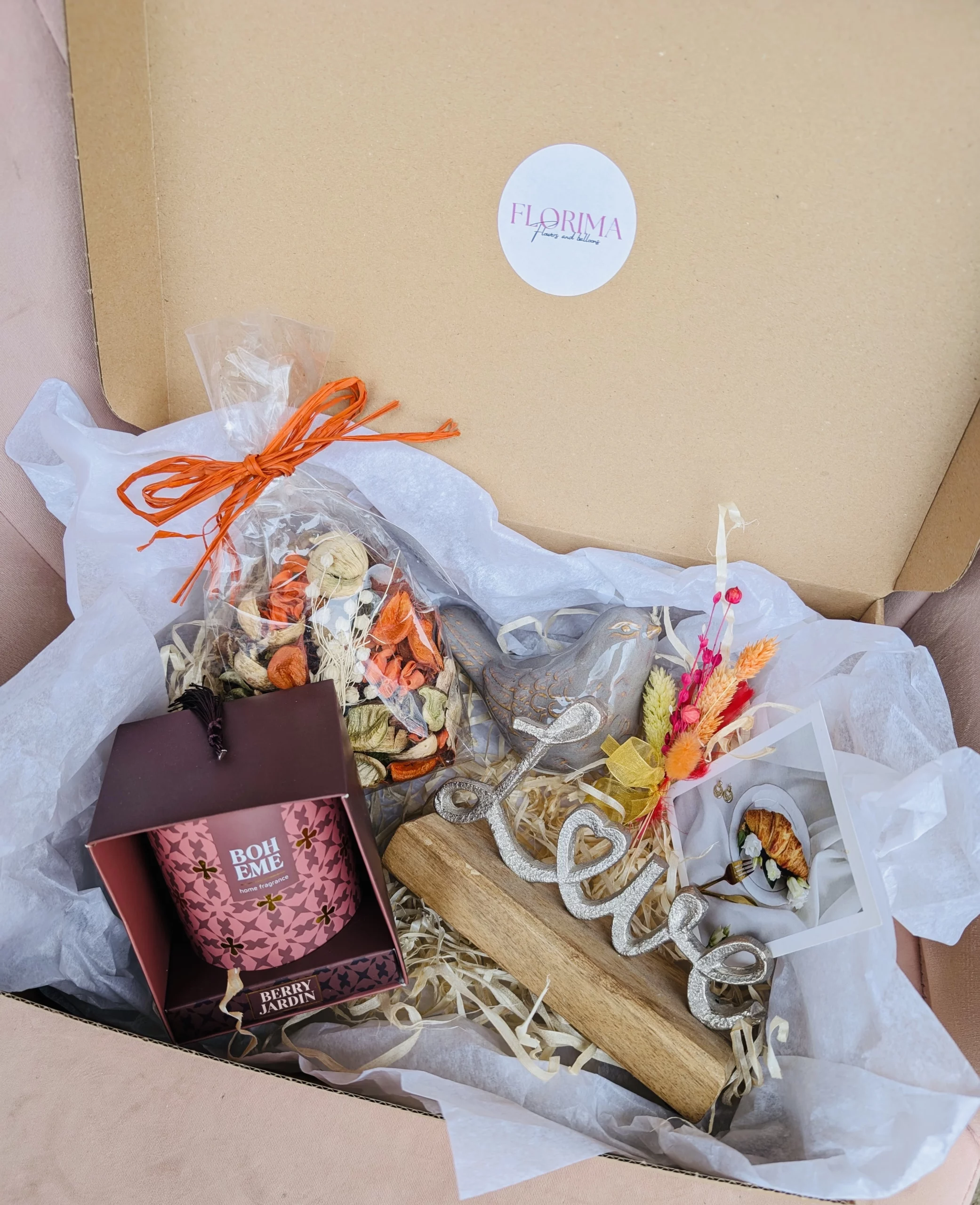 Skład boxu: Ptaszka, „LOVE”, świeca, kartka, mieszanka aromatyzowana. Prezent jest ładnie zapakowany i zawiązany wstążka z kakardą