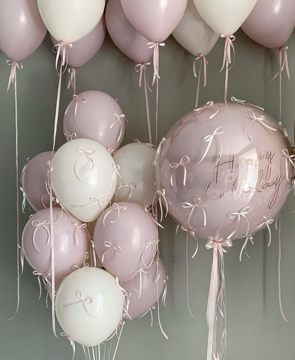 Zestaw bukiet balonów lateksowych z kakardkami, balony pod sufit, podwójny bubble z napisem i kakardkami