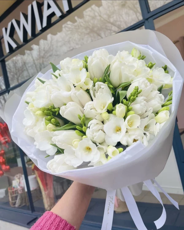 Skład bukietu: tulipan biały, frezja, opakowanie florystyczne