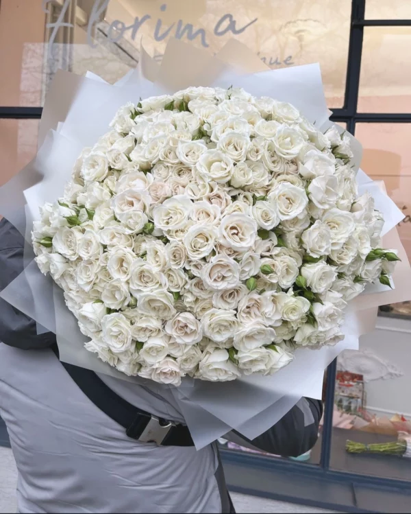Состав букета: 51 шт. белая ветковая роза 60-70 см в флористической упаковке
