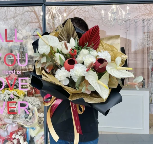 Состав букета: антуриум, тюльпан, гвоздика, роза, эвкалипт, сухоцветы, фисташка, цветочная упаковка