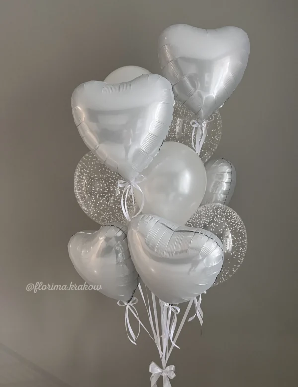 Букеты из латексных шаров (30 см) с белым с сердечками фольга (35 см)