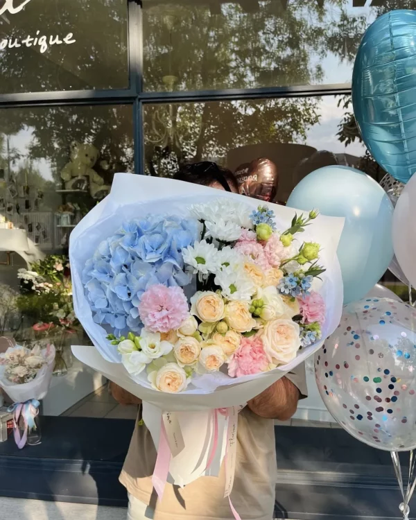 Состав букета: гортензия, роза, фрезия, хризантема, эустома, оксипеталум, гвоздика, цветочная упаковка