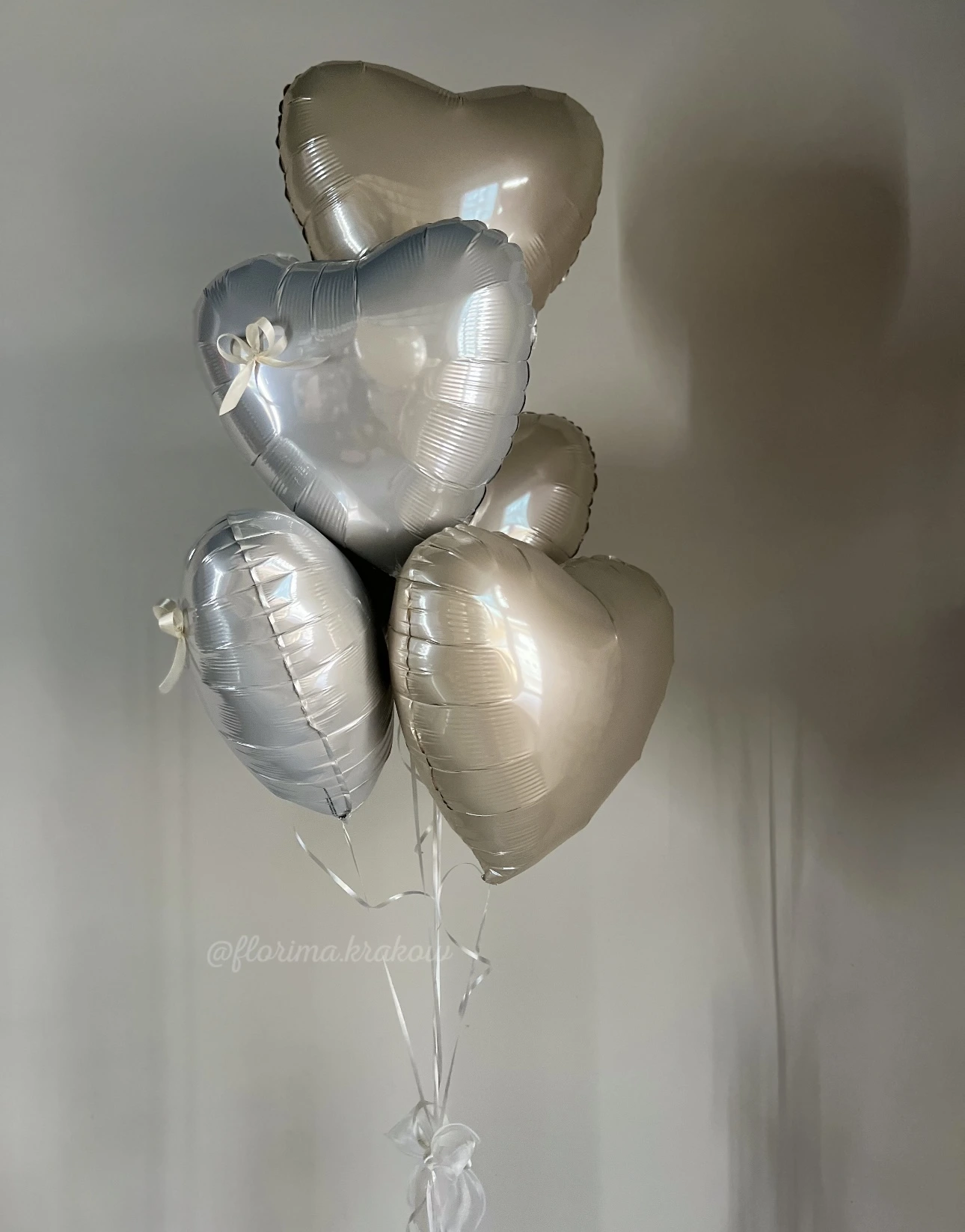 - Воздушные шары из кремовой и серебристой фольги (35 см) в форме сердец, 5 шт.
