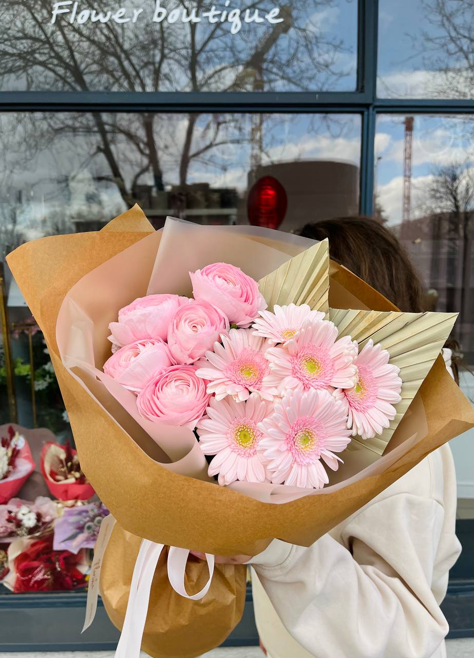 Букет "Розовые герберы и ранункулюсы"