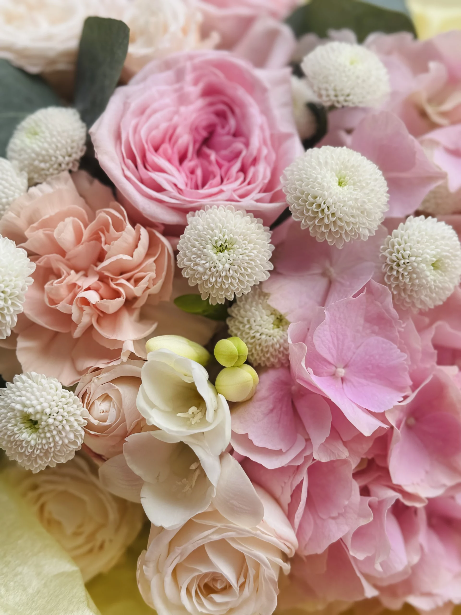 Весенний букет из гортензий, роз и фрезий