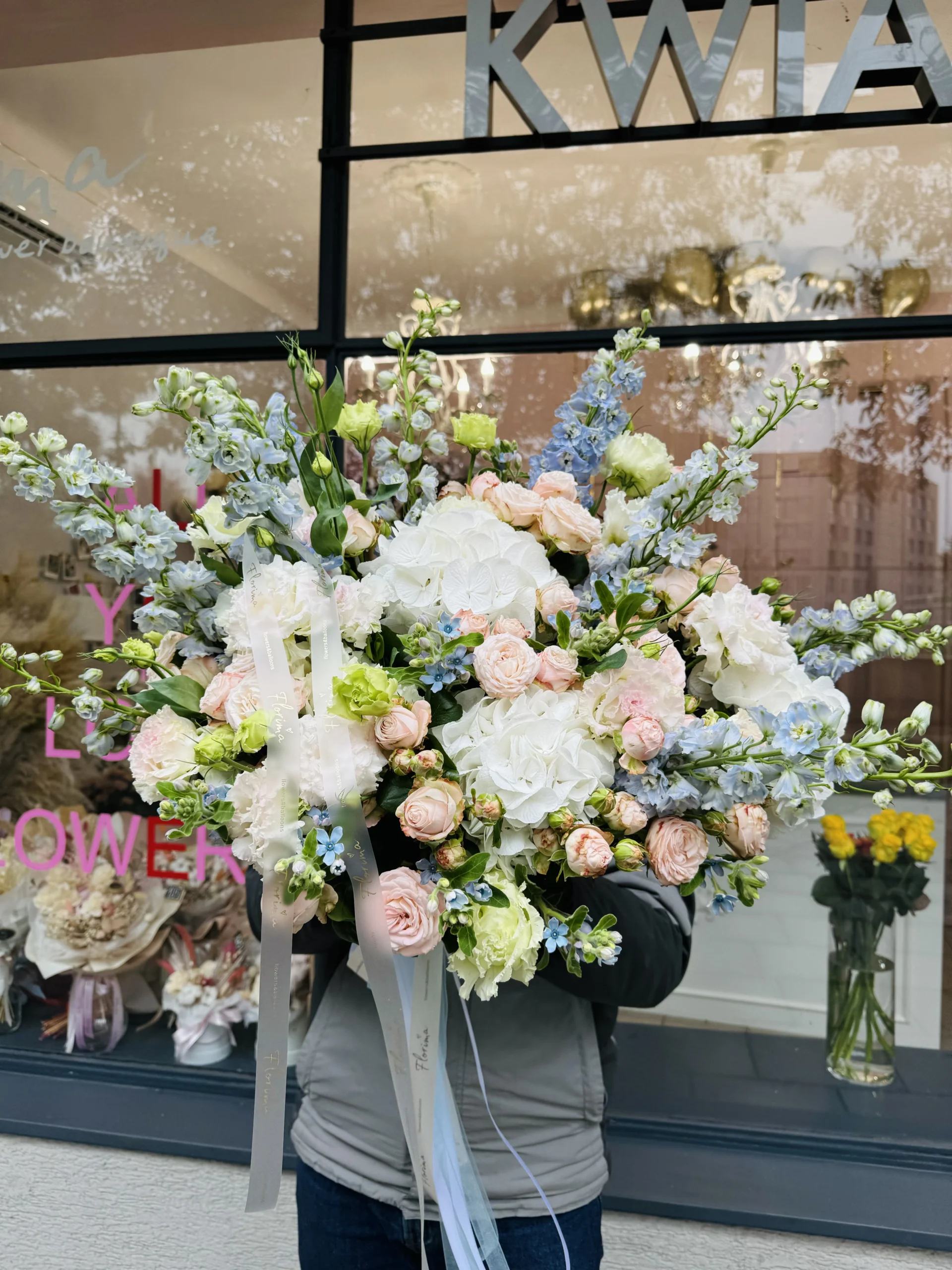 Состав букета: гортензия, дельфиниум, оксипеталлум, ветковая роза, эустома